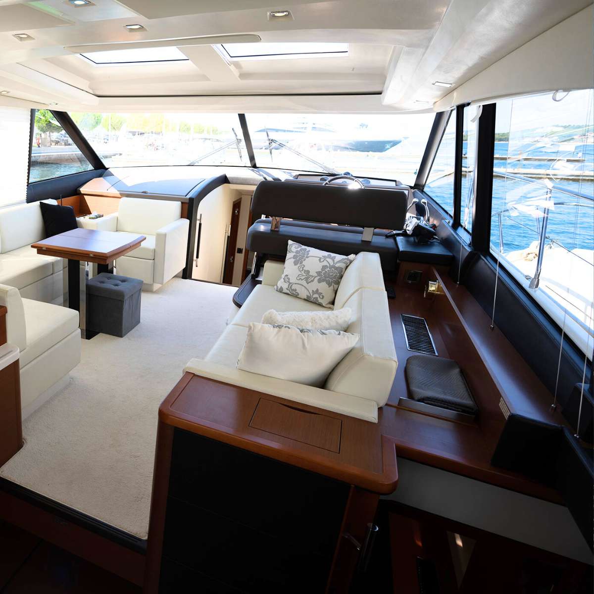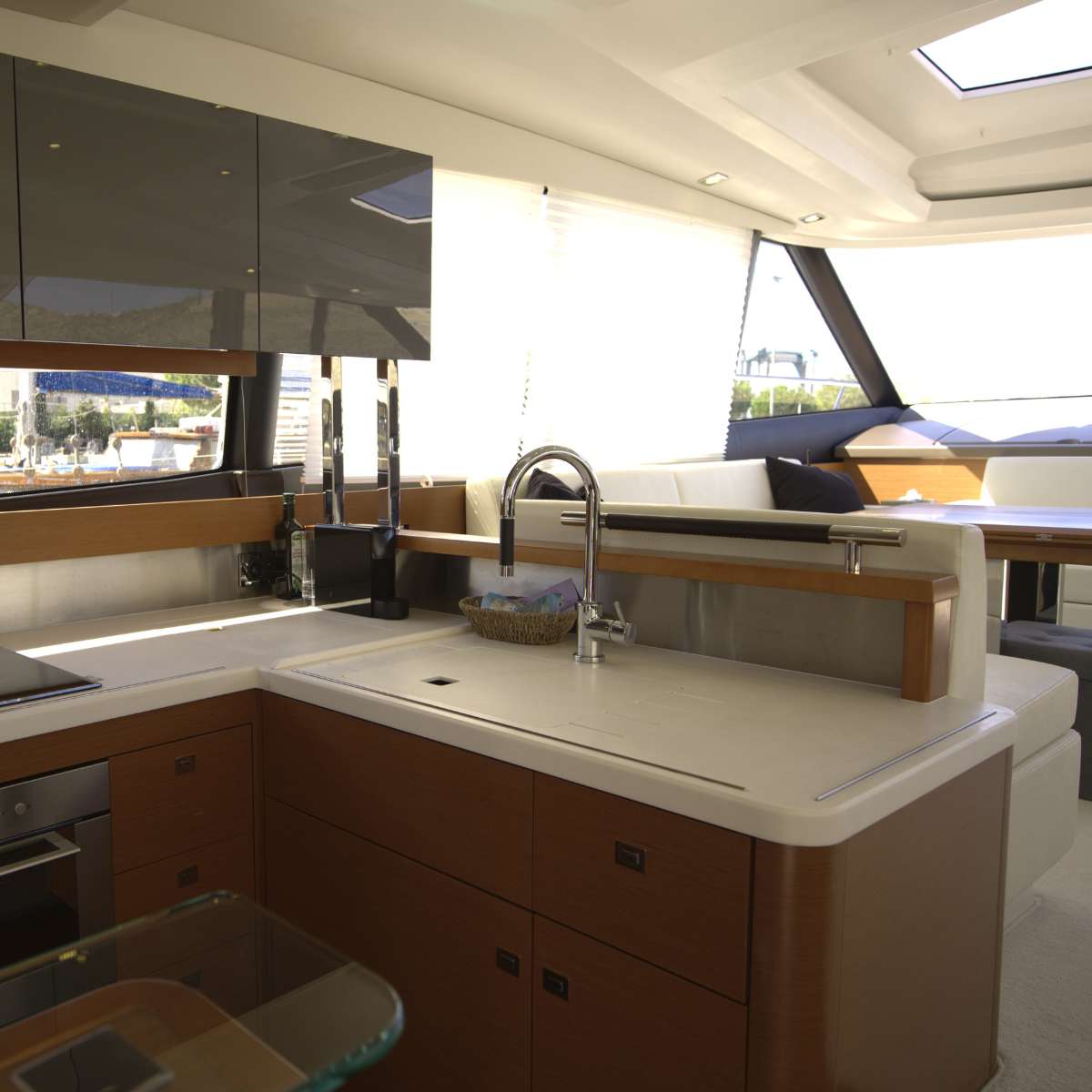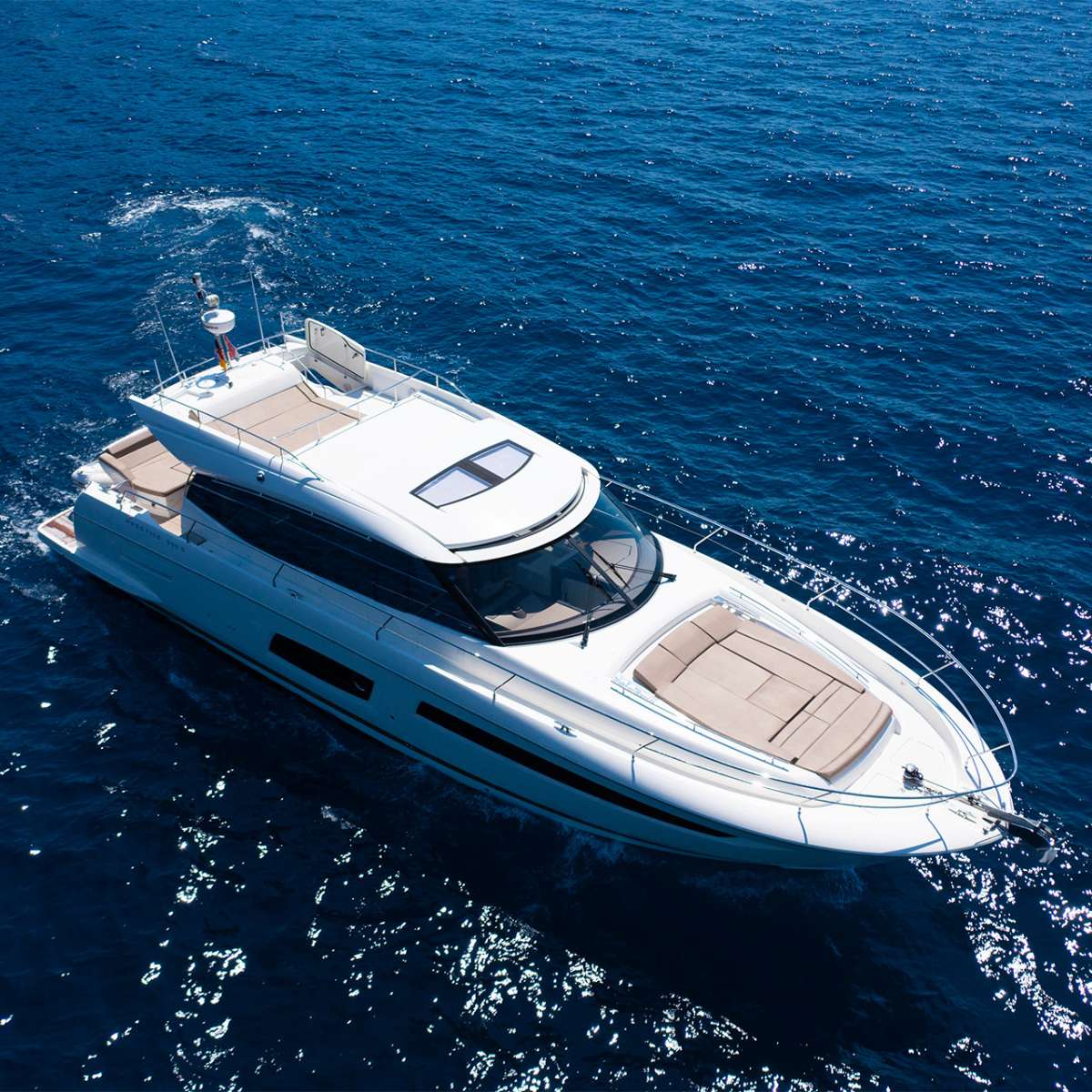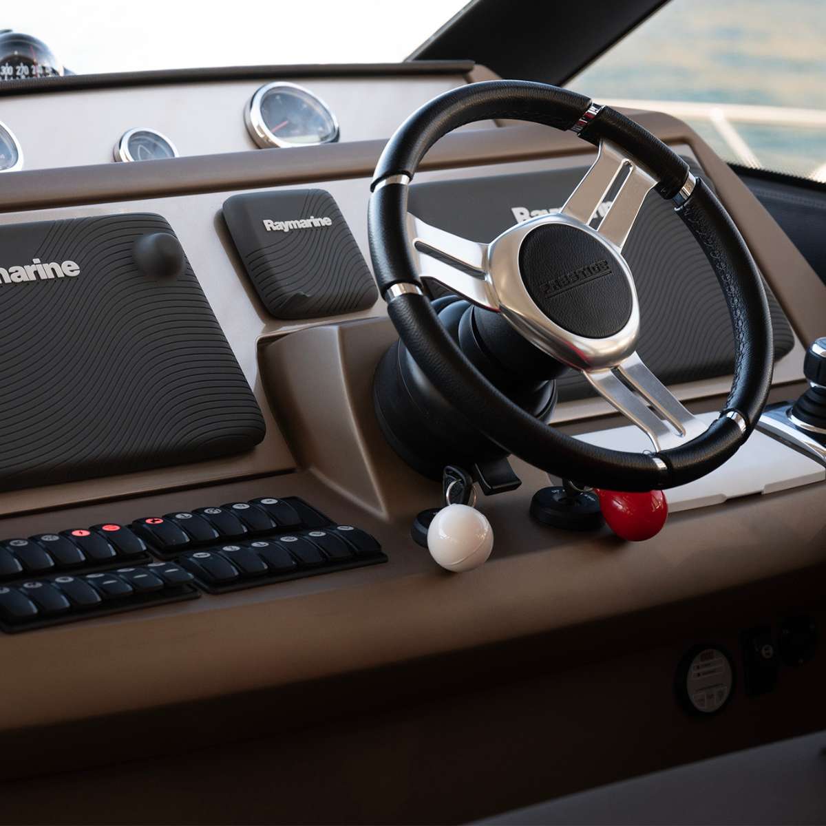 Die PRESTIGE 550S ist eine Weiterentwicklung des erfolgreichen Coupé-Konzepts der JEANNEAU PRESTIGE 500 Yacht. Dank der Mercury Zeus Systeme mit integriertem Joystick kann die Yacht sowohl vom Salon als auch vom Achtercockpit aus bedient werden. Das Innendesign und der große ebenerdige Sitzbereich beeindrucken unsere Gäste mit den großen Cockpitfenstern und dem Glasschiebedach. Gegenüberliegende Sofas und eine modulare Cockpitbank, die zum Salon hin gedreht werden kann, schaffen den perfekten Rahmen für Gespräche und Unterhaltung in kleinen Gruppen. Sie bietet eine zauberhafte Sonnenliege auf der Oberseite des Bootes, von der aus Sie das Meer genießen können.