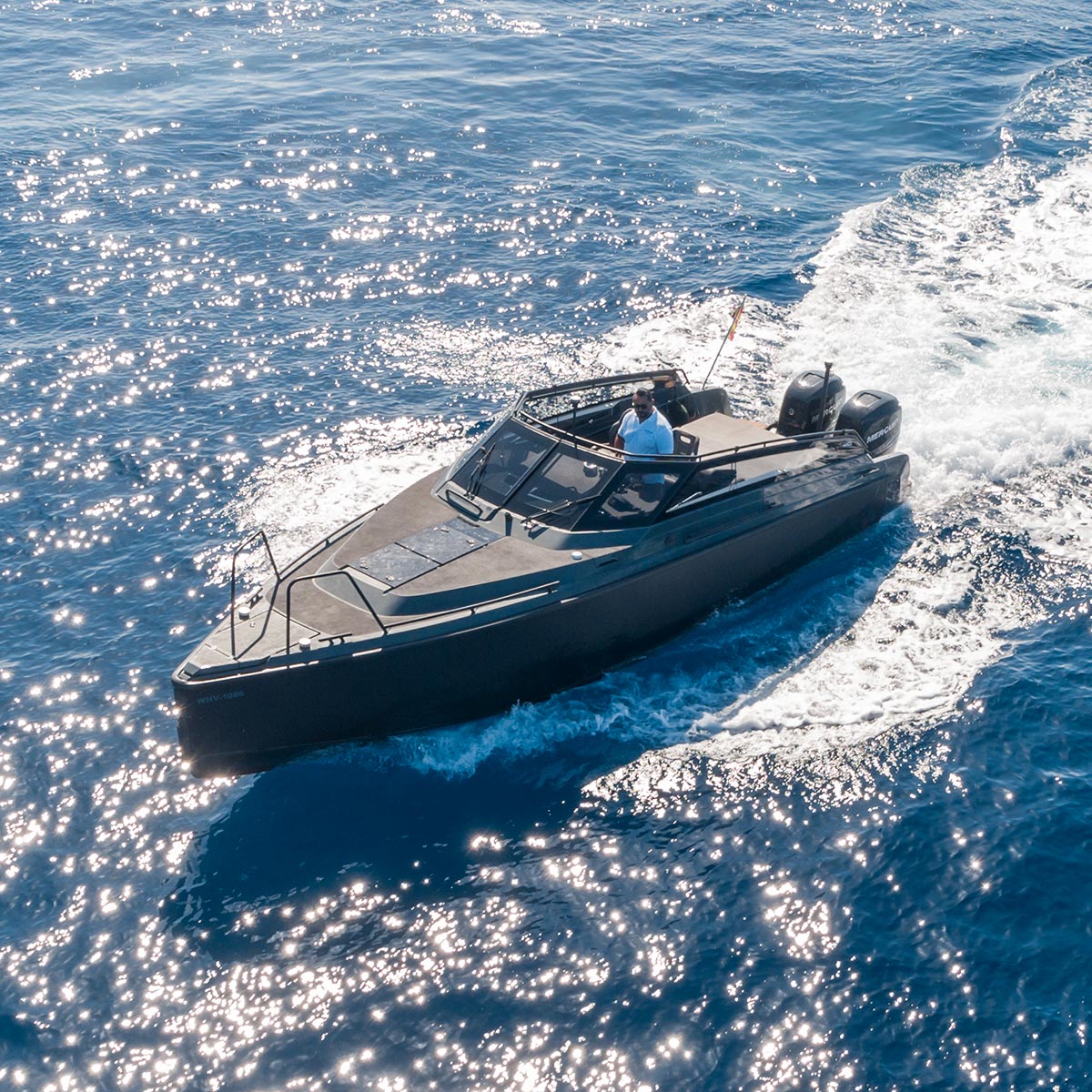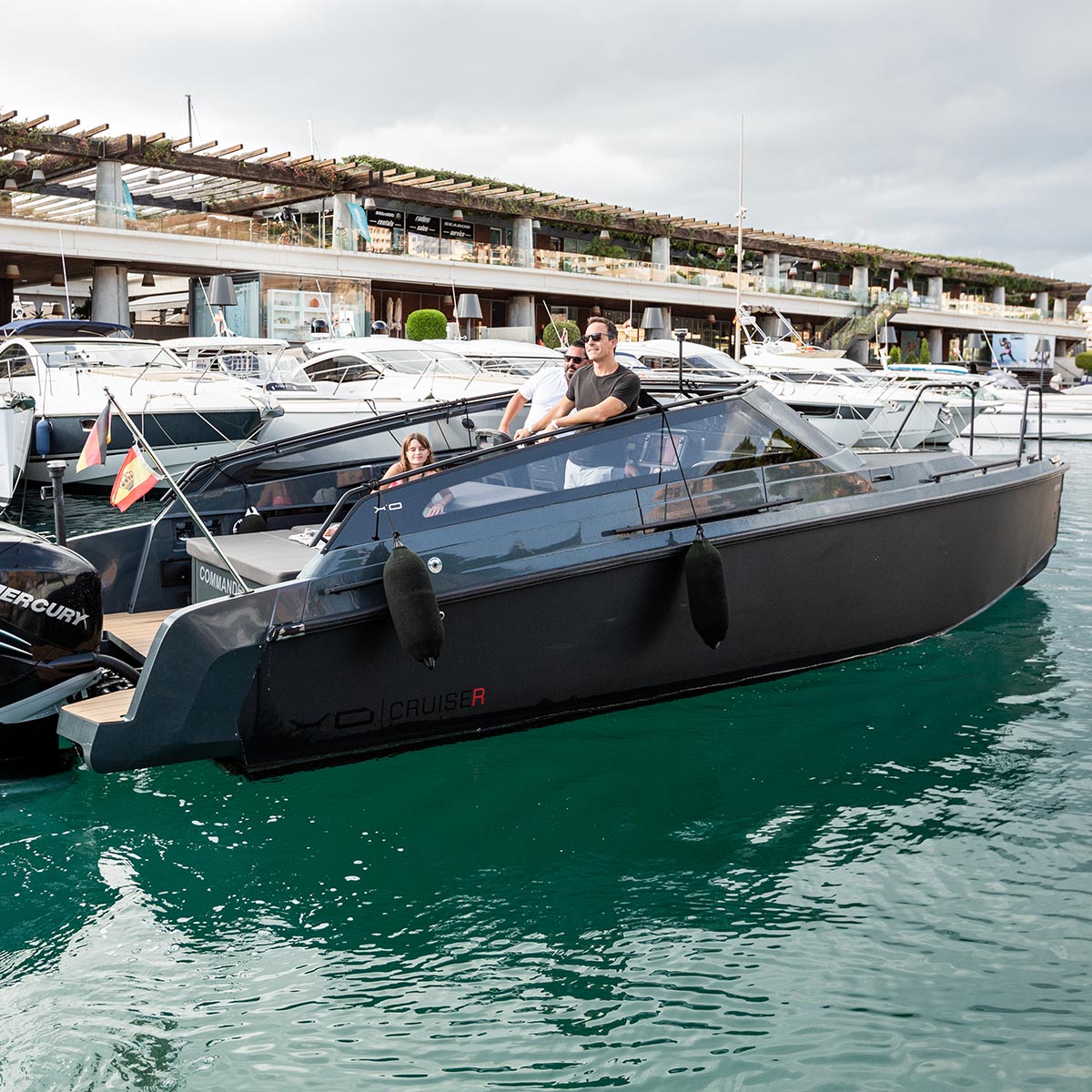 Der XO Cruiser erregt Aufmerksamkeit von dem Moment an, in dem man ihn sieht. Es ist ein fantastisch aussehendes Boot mit straffen Linien und einer ungewöhnlichen Lage auf dem Wasser. Besonders in der Schwarz-auf-Schwarz-Farbgebung ist dieses Boot ein echter Blickfang. Der Rumpf ist, wie bei allen XO Booten, aus Aluminium. Somit ist der XO Cruiser leichter, wendiger und schneller als die meisten vergleichbaren Boote seiner Art.