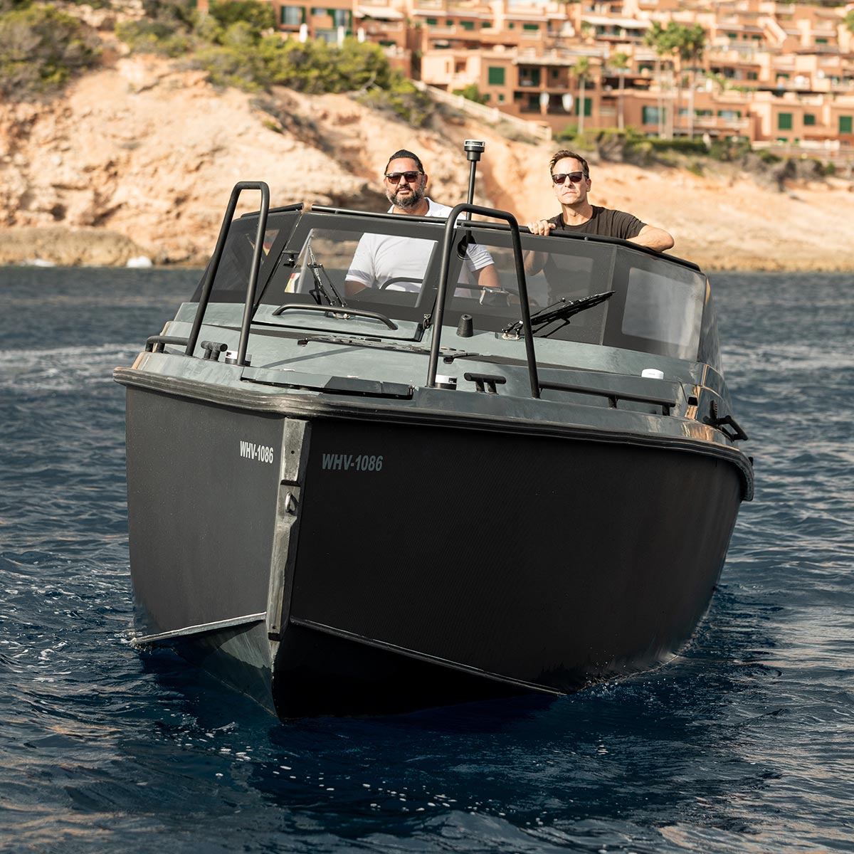 Der XO Cruiser erregt Aufmerksamkeit von dem Moment an, in dem man ihn sieht. Es ist ein fantastisch aussehendes Boot mit straffen Linien und einer ungewöhnlichen Lage auf dem Wasser. Besonders in der Schwarz-auf-Schwarz-Farbgebung ist dieses Boot ein echter Blickfang. Der Rumpf ist, wie bei allen XO Booten, aus Aluminium. Somit ist der XO Cruiser leichter, wendiger und schneller als die meisten vergleichbaren Boote seiner Art.